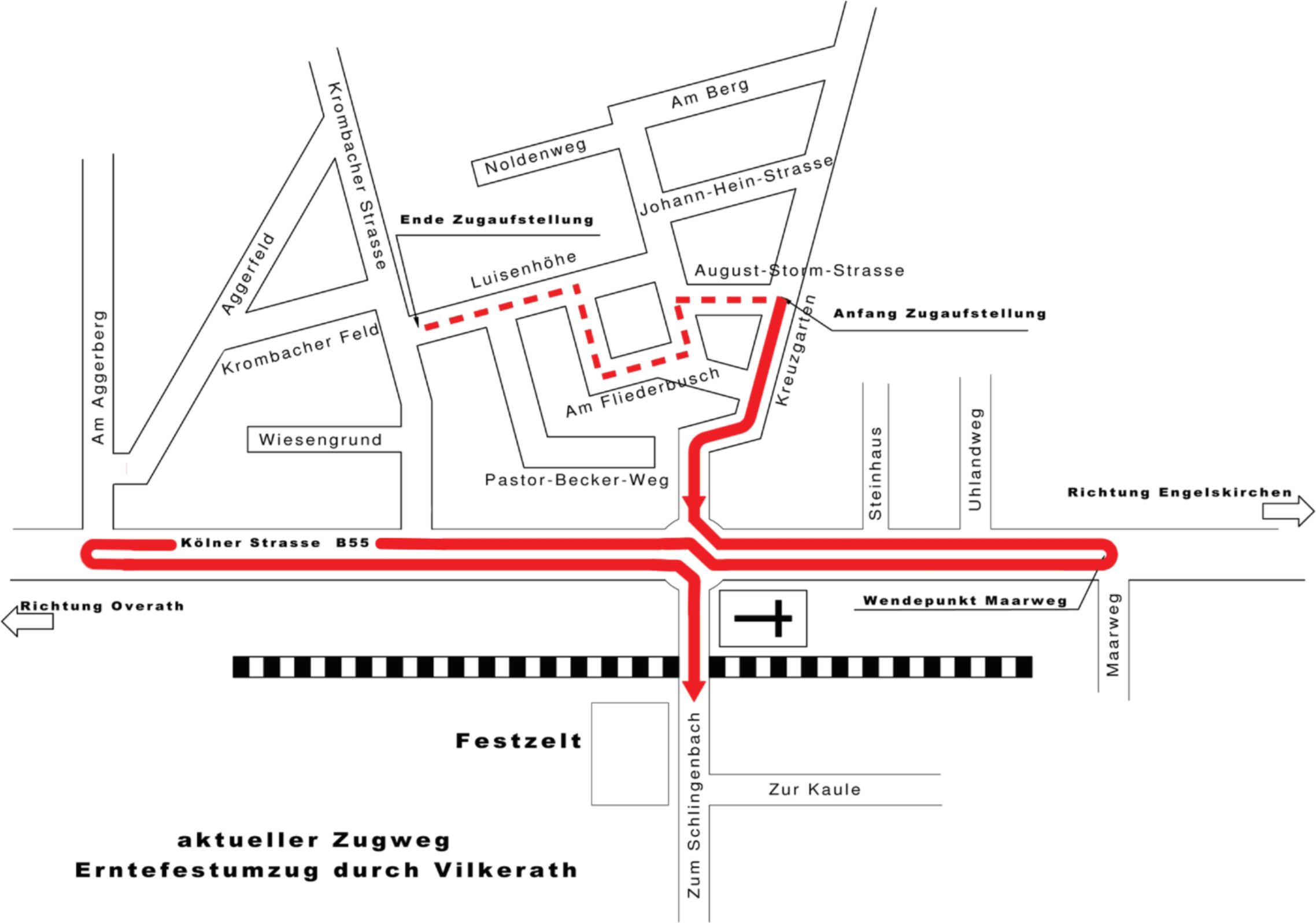 Das Landwirtschaftliche Casino Vilkerath hat sich dazu entschlossen, den aus den vergangenen Jahren bekannten Zugweg zu verändern. Neu ist, dass der Zug in Höhe der Einmündung „Am Aggerberg“ dreht und wieder zurück Richtung Ortsmitte geht. Die zahlreichen Zuschauer an der Kölner Straße werden den Zug somit an jeder Stelle zweimal genießen können.